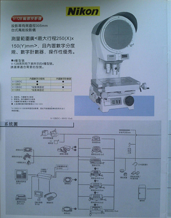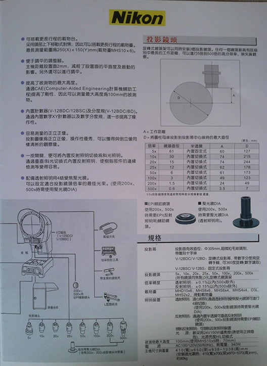 日本尼康V-12系類(lèi)是一款高密立式正像投影儀,帶有直徑305mm超微粒毛玻璃投影屏。多款行程測(cè)量工作臺(tái)和3鏡頭【5X/10X/20X/50/100X/200X/500X可選】 旋轉(zhuǎn)頭,高清晰的成像,高解析度,廣泛應(yīng)用于高度工件的比較測(cè)量和直接讀數(shù)測(cè)量,是一款型密投影儀。